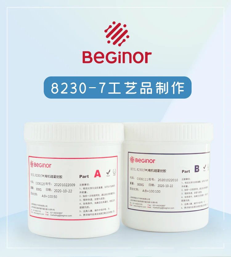 Besil 8230(7#) A/B 是一种双组分低密度有机硅灌封胶,经混合后具有很好的流动性,操作时间可根据温度调整,室温可深层固化,适用各种散热耐温元件的灌封保护,完全符合欧盟ROHS指令以及SVHC REACH要求。